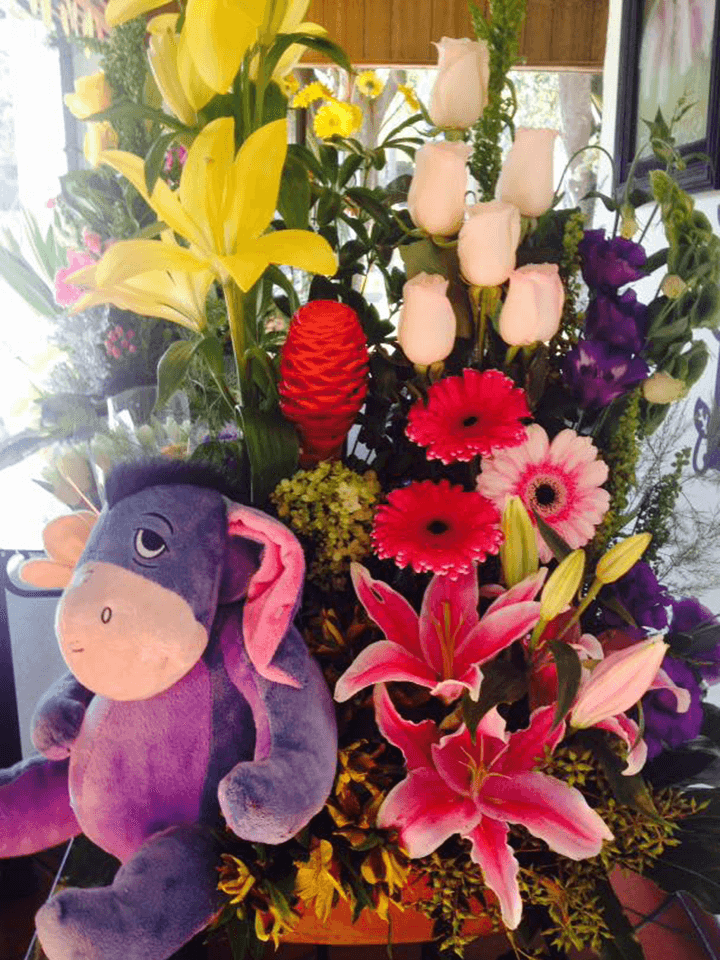Canasta grande con oso de peluche, rosas, gerberas, Lily, delphinium, concador y follaje